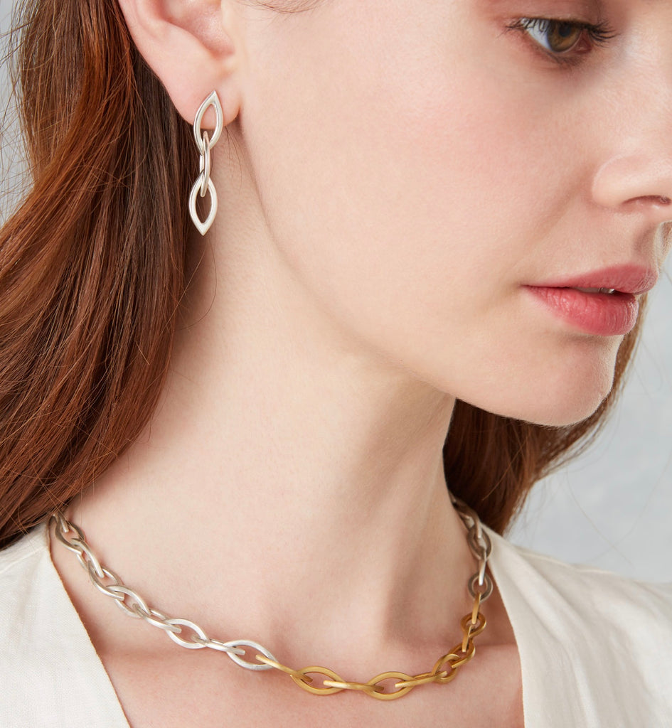 This chain is handmade with the marquise shaped links used in all the Dalia collection pieces. It has 7 solid 18ct gold links nestled amongst the silver and each individual link is 17.5mm long and 8mm wide. The simple clasp is hidden when the chain is done up and a cleverly placed silver granule helps the wearer locate it when it's time to take the chain off.