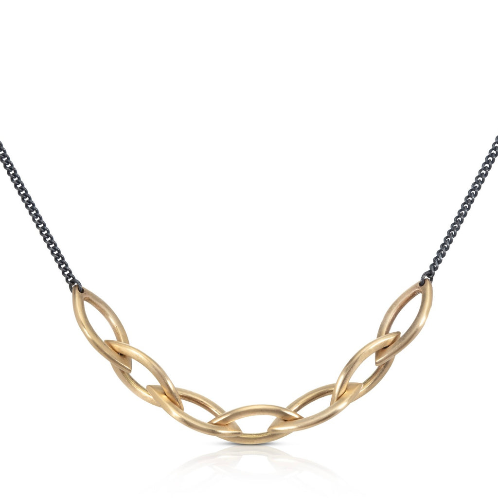 This Dalia necklace is made up of a small section of handmade chain, seven 18ct gold links, all hanging on an oxidised fine silver chain. It is 16" in length, designed to sit on the collar bone.