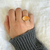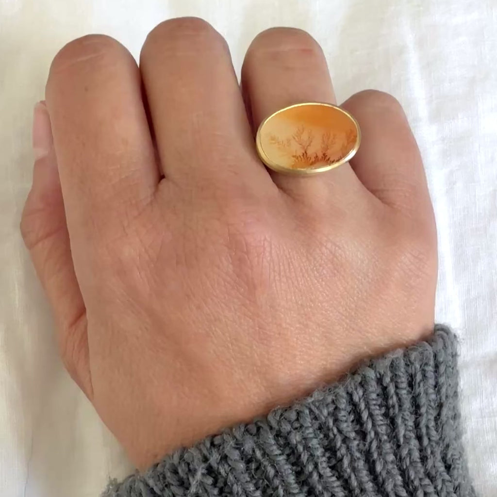 An oval dendritic agate set in 18ct yellow gold with a silver base and band. The stone has a wonderful, warm orange glow that is complimented by the buttery yellow of the gold.