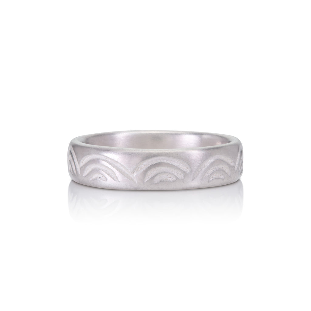 A silver band inspired by my love of doodling. The pattern has been drawn onto a wax ring and then hand carved and cast in silver to give a perfectly imperfect look reminiscent of real doodles.