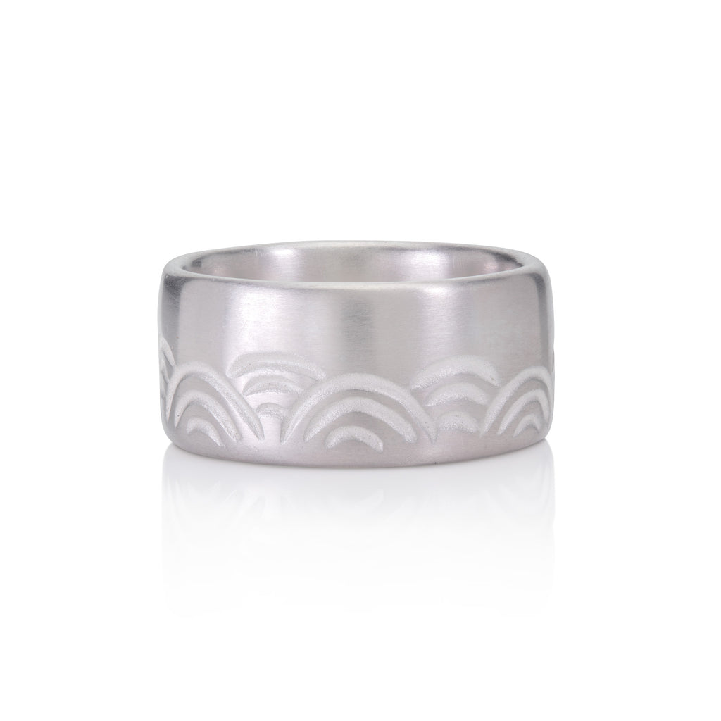 A wide silver band inspired by my love of doodling. The pattern has been drawn onto a wax ring and then hand carved and casat in silver to give a perfectly imperfect look reminiscent of real doodles.