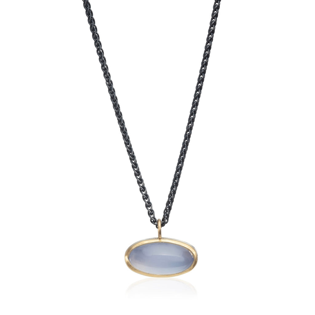 A long oval chalcedony set in 18ct yellow gold on a silver base and hanging on a 16" oxidised silver chain.