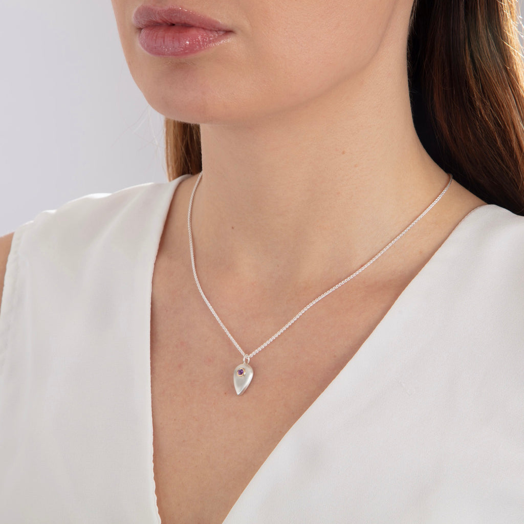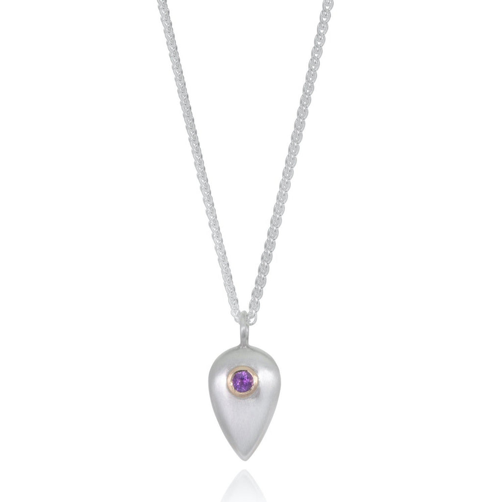 A drop of solid sterling silver with a 3mm amethyst set in 18ct gold. Simple and tactile this is a pleasure to wear and looks great alone or layered with other necklaces.