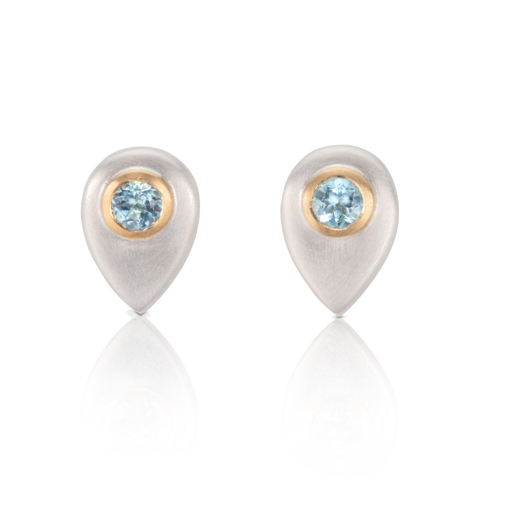 Sweet little teardrop studs with aquamarines. The teardrop is silver and approx 7x10mm and the aquamarines are set in 18ct yellow gold. Perfect everyday earrings.